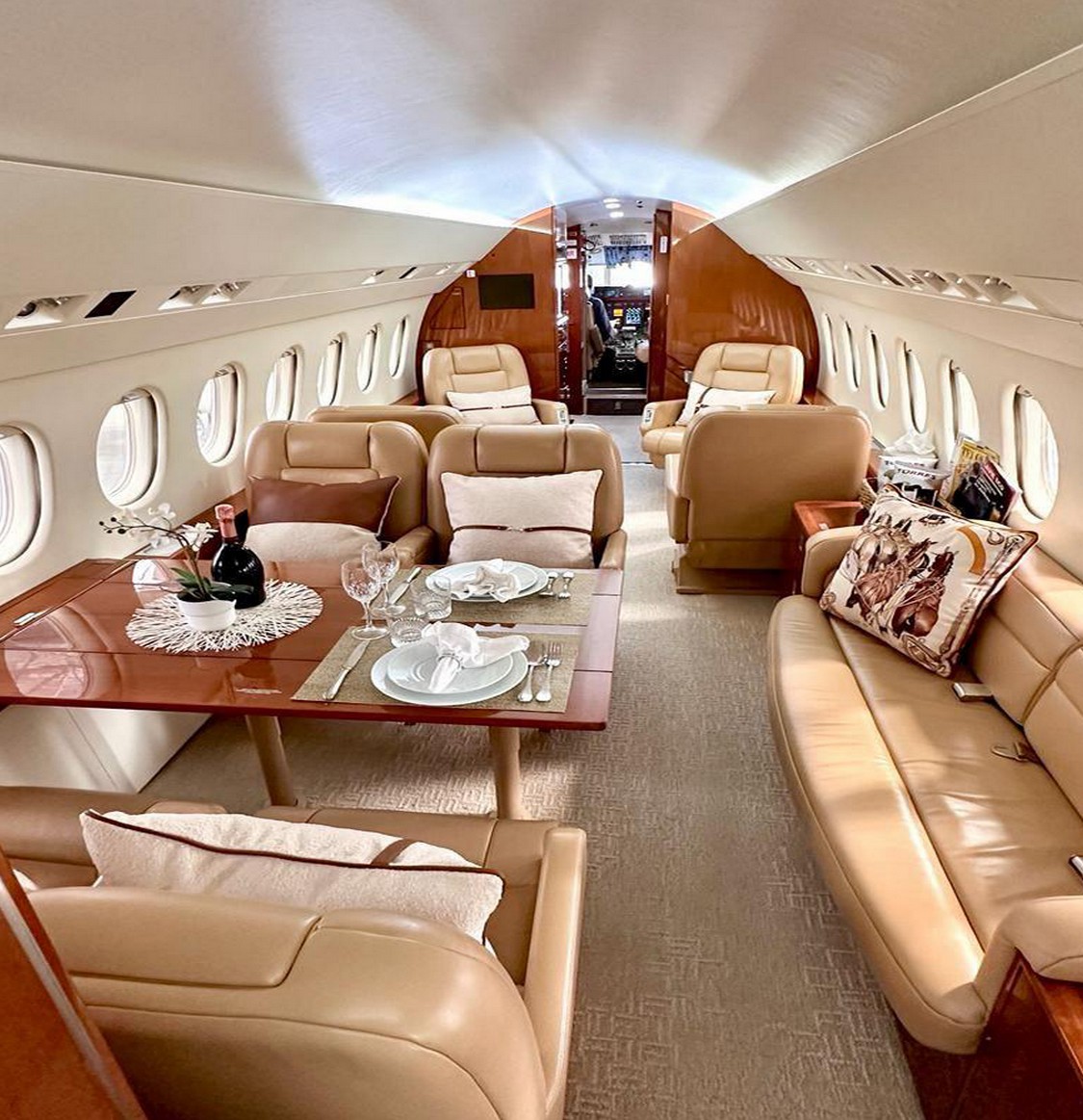 L’avion est piloté par deux pilotes, et grâce à sa configuration à haute densité, il peut accueillir jusqu’à 9 passagers. La cabine a été conçue en intégrant des fauteuils inclinables et pivotants à 360°, munis d’appui-tête et de repose-pieds réglables.